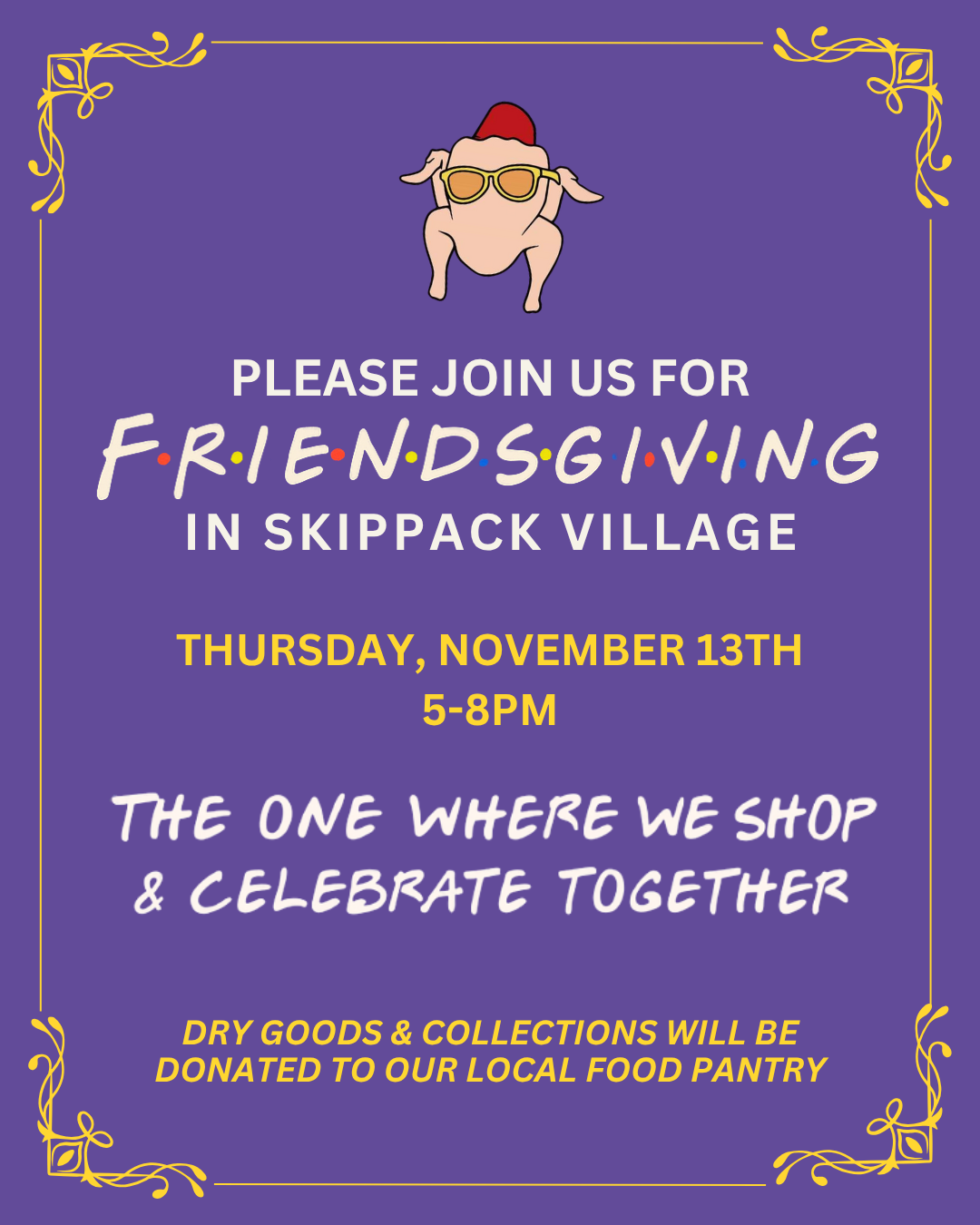 Join Skippack Village by stepping into the world of Friends with themed photo ops, treats, trivia & purple-door shopping inspired by iconic episodes!
