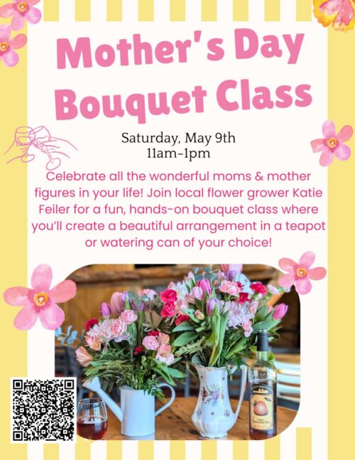 Celebrate all the wonderful moms and mother figures in your life at the Mother’s Day Bouquet Class on Saturday, May 9th from 11 a.m. to 1 p.m. Join local flower grower Katie Feiler for a fun, hands-on bouquet class where you’ll create a beautiful arrangement in a teapot or watering can of your choice. Scan the QR code to register for this special event.