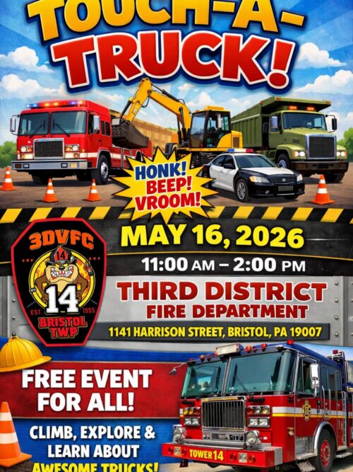 Join the Third District Volunteer Fire Department for Touch-A-Truck on May 16, 2026, from 11:00 a.m. to 2:00 p.m. at 1141 Harrison Street, Bristol, PA 19007. This free event for all ages invites kids to climb, explore, and learn about awesome trucks including fire engines, police cars, construction vehicles, and more. Hear the honks, beeps, and vrooms as you get up close with a variety of vehicles in this fun, hands-on community event.