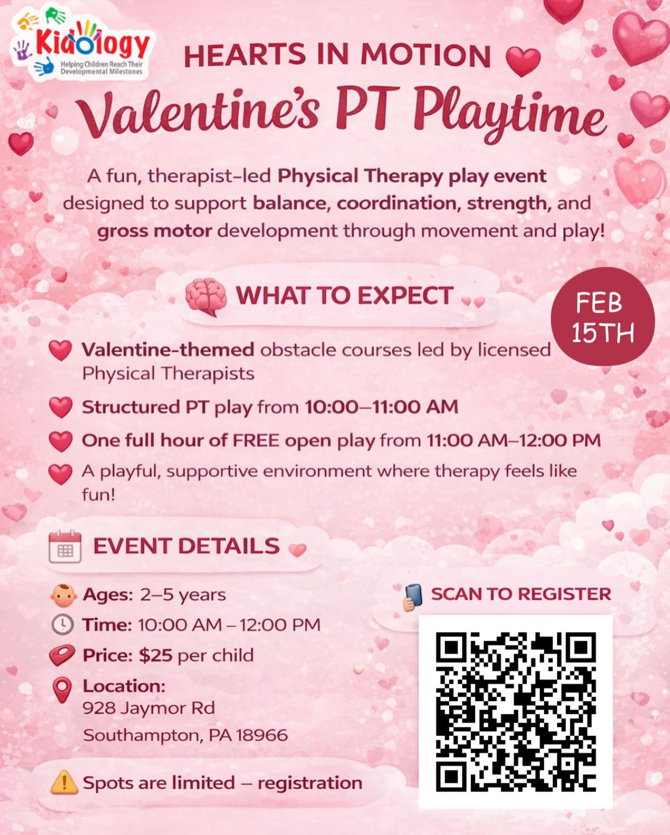 Families are invited to a Valentine’s‑themed Physical Therapy play session designed for children ages 2–5. Led by licensed pediatric PTs, this event features festive obstacle courses that support balance, coordination, strength, and gross motor development. Children will enjoy one hour of structured PT‑guided play followed […]