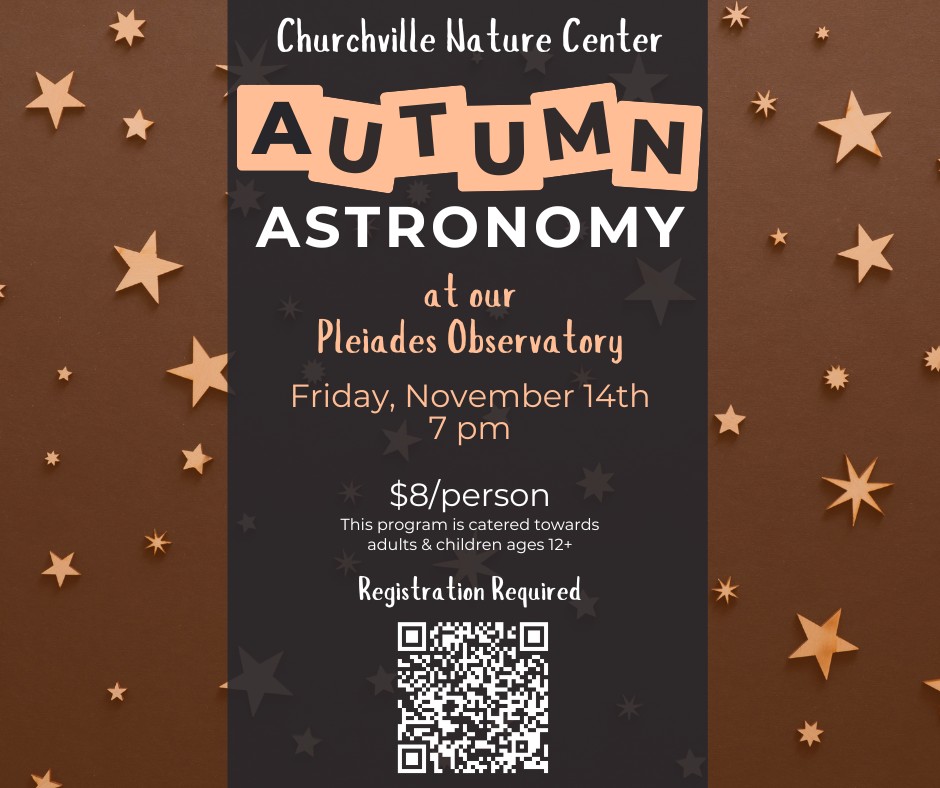 Come to our Pleiades Observatory at the Churchville Nature Center and learn about what’s in the night sky this time of year! On Friday, November 14th at 7:00 pm, learn about astronomy and the equipment astronomers use, then get the chance to look through their […]