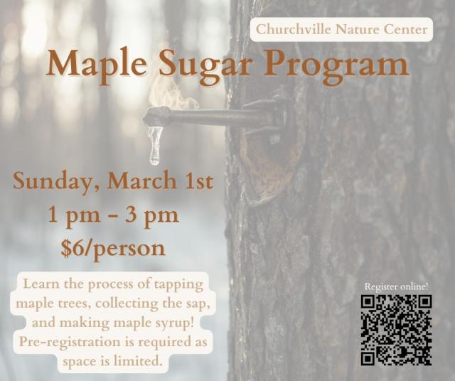 Join the Churville Nature Center for their annual Maple Sugar Day program on Sunday, March 1st from 1-3pm. Learn the process of tapping trees, collecting the sap, and making maple syrup. Participants will get the chance to sample real maple syrup and learn about the […] |