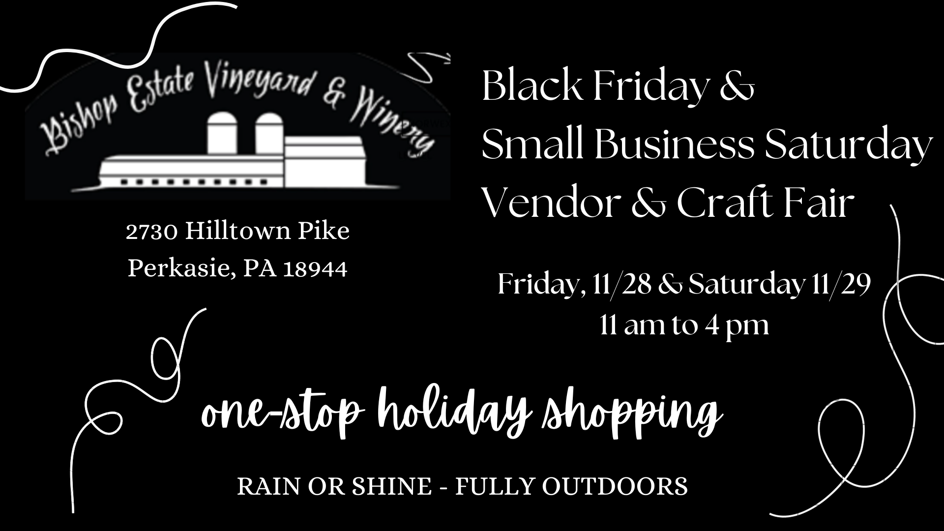 Bishop Estate Winery 2730 Hilltown Pike, Perkasie, PA, United StatesJoin Bishop Estate Winery for a festive outdoor market featuring over 100 local vendors—perfect for finding unique, personal holiday gifts you won’t get online! Admission is free, so come out between 11 AM and 4 PM to sip, shop, and celebrate the season. Enjoy a […]