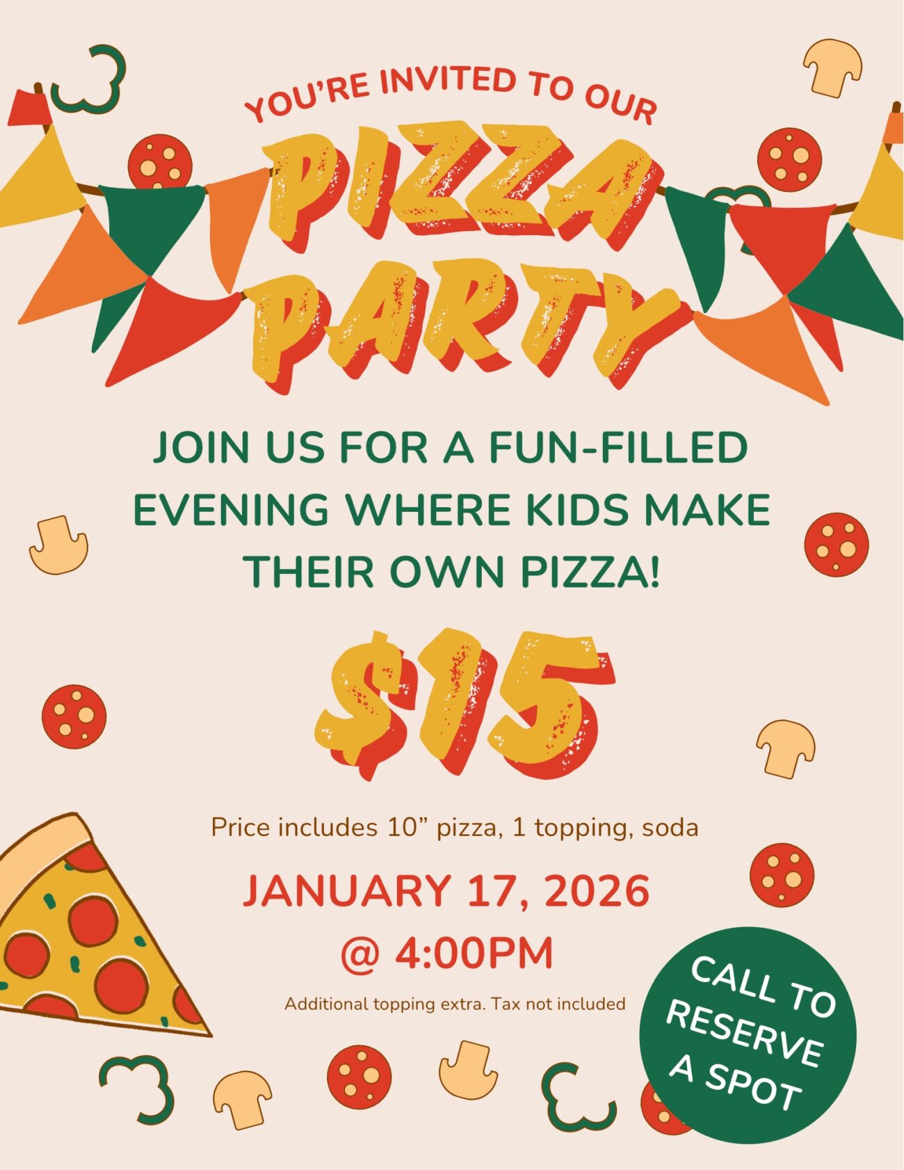 Price includes 10” pizza, 1 topping, soda