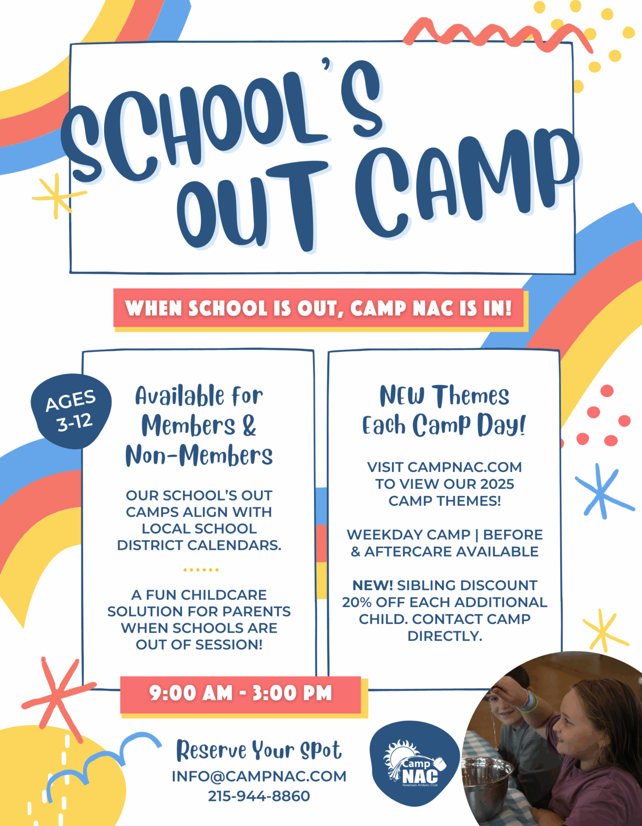Camp NAC provides exciting and dependable childcare options for days when schools are closed during the academic year, including holidays, teacher in-service days, and scheduled breaks. We align with local school district calendars—Council Rock, Neshaminy, Pennsbury, and St. Andrew’s—offering a seamless solution for busy parents.