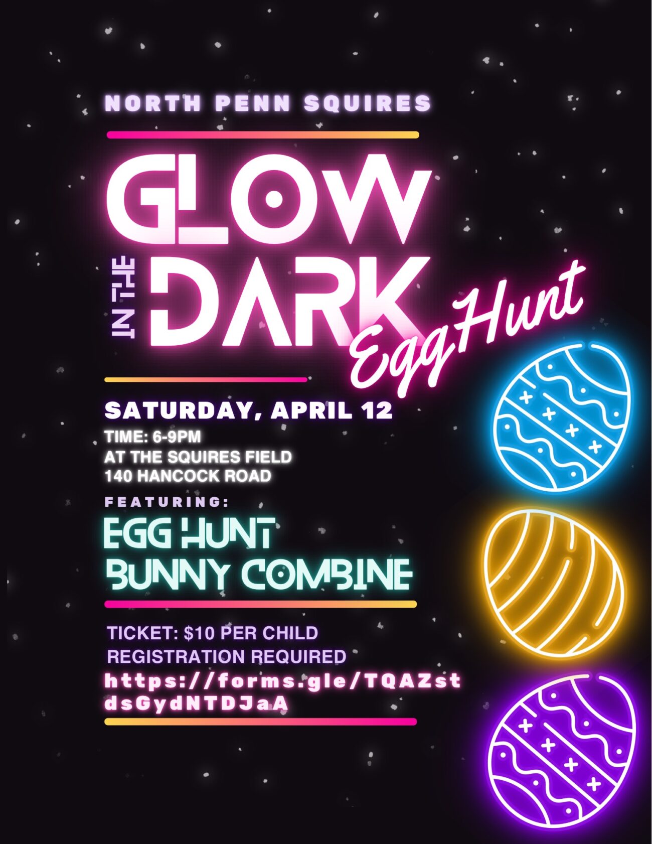 Get ready for an unforgettable evening at the Glow in the Dark Egg Hunt & Bunny Combine hosted by Squires Football. Kids can test their skills in a football combine before grabbing their baskets for an exciting glow-in-the-dark egg hunt. The event will take place